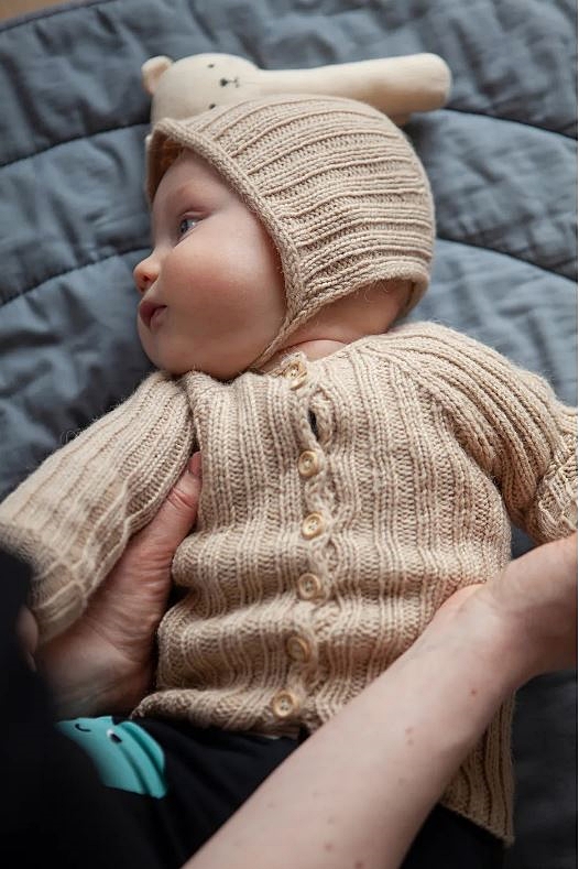 Habo babykofta är en nätt liten kofta till de allra minsta. Den stickas helt i resår för ett figurnära och följsamt plagg. Koftan stickas nedifrån och upp och knapphål stickas in allteftersom.