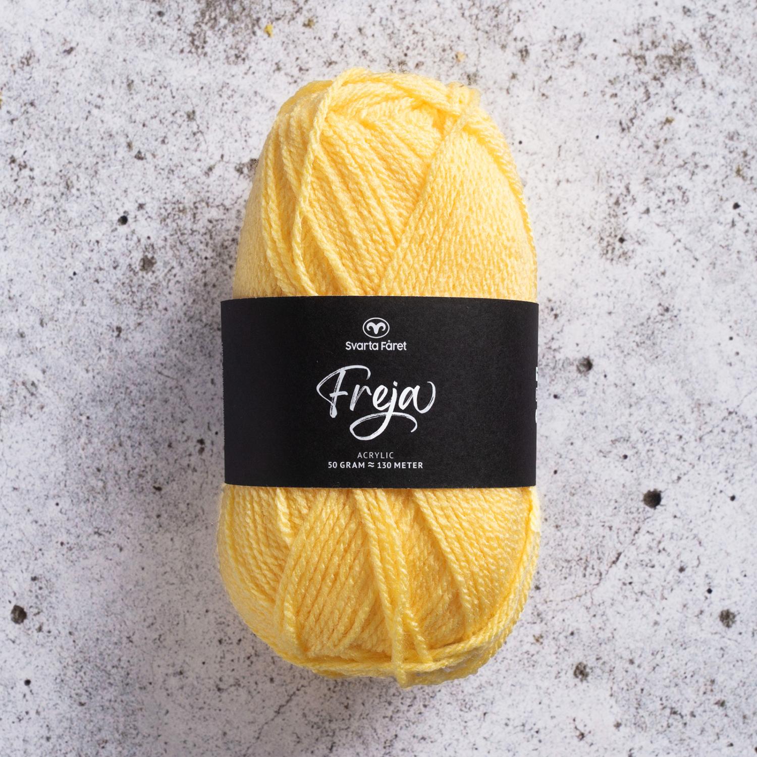 Vårt älskade Freja är ett mjukt och följsamt garn av 100% akryl. Garnet är lättstickat och passar lika bra till tröjor och koftor som sockor och vantar – både för vuxna och barn. Freja är upplagt på 50 grams nystan om 130 meter, och stickfastheten 20 maskor på stickor nr 4 ger 10 cm. Plagg som stickas med Freja tvättas i 40 graders maskintvätt. Med närmare 50 färger att välja bland är det bara kreativiteten som sätter gränser för vad du kan skapa med detta omtyckta garn.