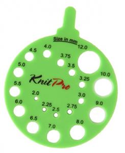 - Hål för att mäta 19 stickstorlekar från 2 mm - 12 mm samt motsvarande US storlekar 0-17. (Dvs du måttet översätter samtidigt US storlekar till mm).