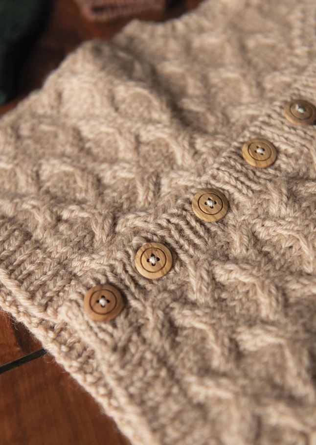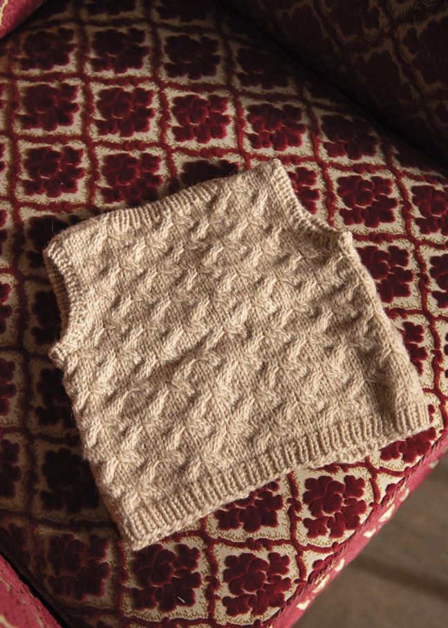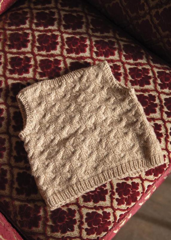 Det här är en enkel liten barnväst som stickas nedifrån och upp. Den har en flätstruktur som du snabbt lägger på minnet och gör stickningen lagom utmanande. Axeln är sammanfogad med en three needle bind off. Alla resårkanter plockas upp och stickas sist.