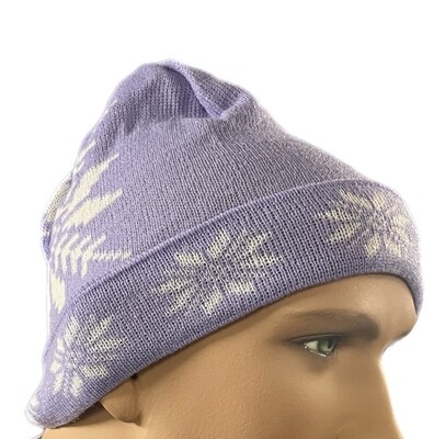 En lila stickad mössa i 100% akryl med vita snöflingor som motiv. Den är tunn, stretchig och sitter bekvämt på huvudet – perfekt för dig som vill ha en lätt men ändå varm mössa under kyliga dagar.