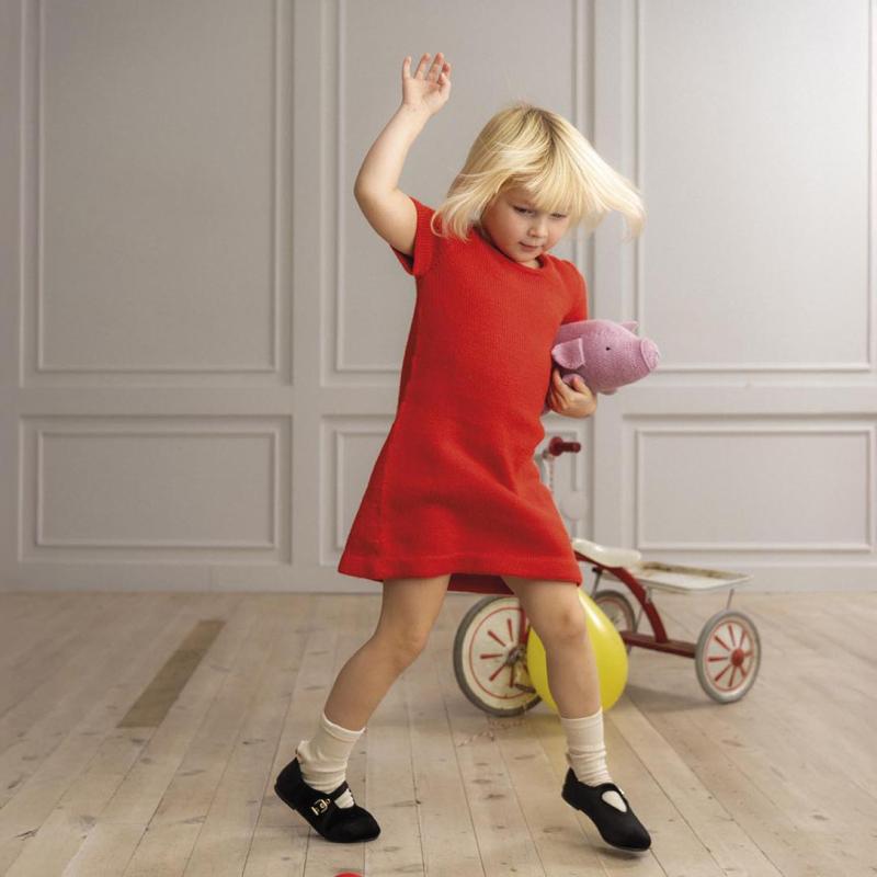 Lottas korta, röda lilla klänning stickas uppifrån och ner. Först stickas en bit på bakstycket, därefter de båda axlarna, och till sist plockas maskor för ärmarna upp och klänningens överdel stickas runt. Det ökas kontinuerligt i sidorna för vidd i kjolen. Klänningen avslutas med nätta detaljer som dubbelvikta fållar och i-cord i halsringningen.