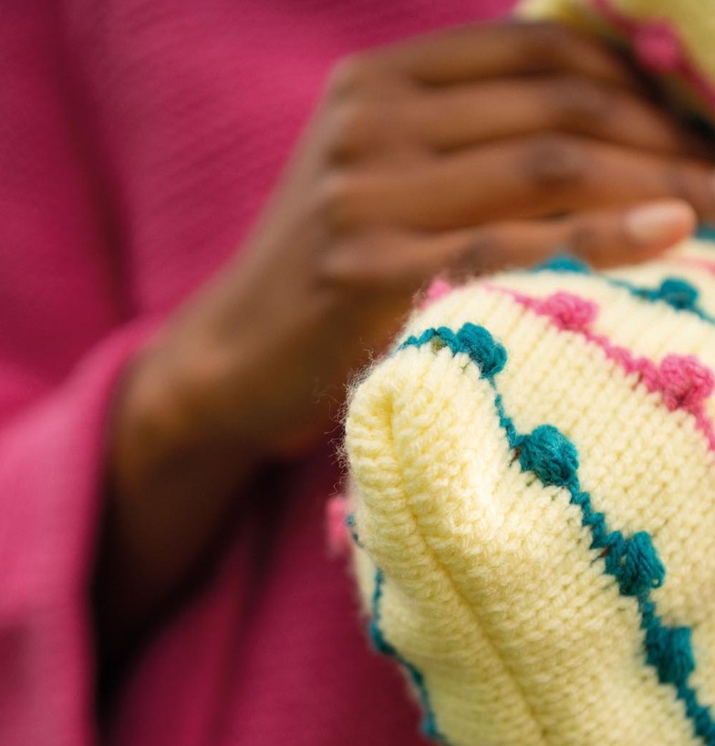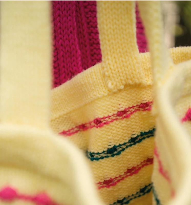 Väskan är en klassisk tygpåse med härliga detaljer. Dubbelstickade handtag ger lite stadga och ränderna med popcorn bidrar med glädje!