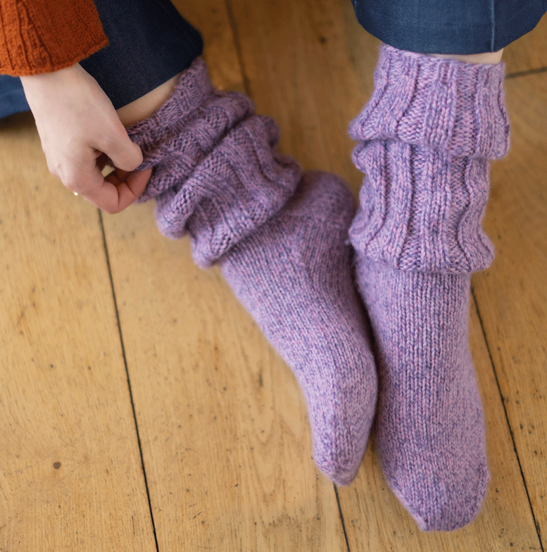 Princeton är ett par sockor med långt, nedhasat skaft i skönaste 80-talsstilen. De stickas uppifrån och ned med en klassisk hällappshäl.
