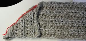 Vik upp kanten och virka dit en röd kant (med rött garn, 1 tråd) med fasta m.