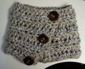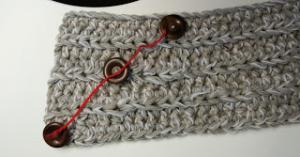 Då halskragen är så lös i sig behövs inga knapphål utan du sticker bara igenom knapparna längs kortsidan. Vill du gärna ha knapphål så kan du hoppa över näst sista hst på v 1, 5 och 7, och ersätta den med 1 lm. På nästa v virkas då hst runt denna lm.