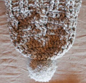 Gör en tofs "på klassiskt vis" med genom att snurra garn runt två cirklar med hål i gjorda av hård kartong. Sy fast tofsen på mössan.