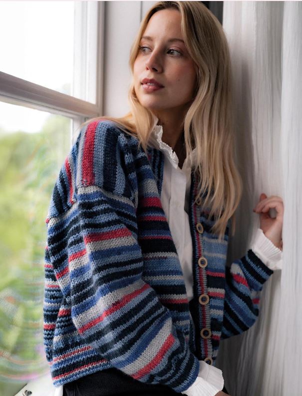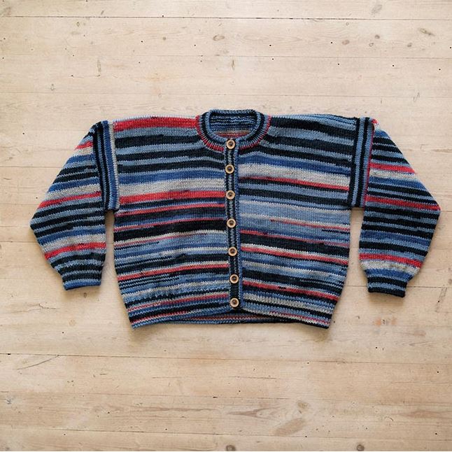 Det flerfärgade garnet gör den rolig att sticka och ger liv åt den enkla modellen.