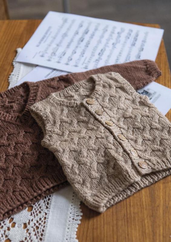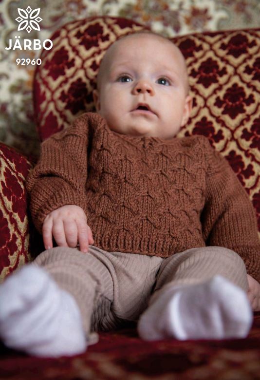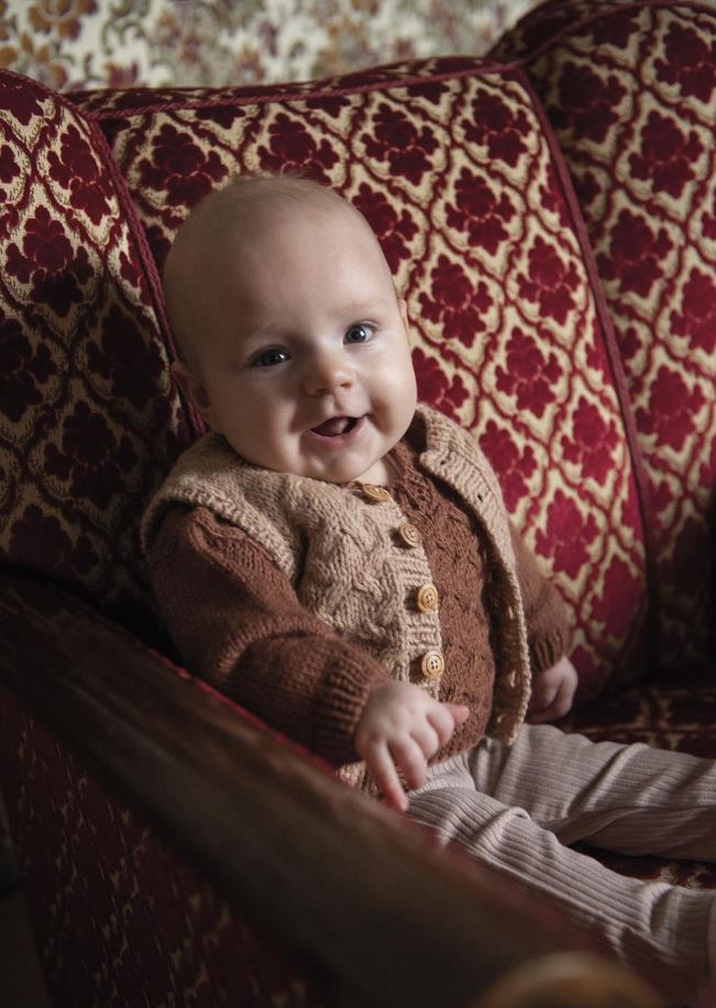 Den här lilla tröjan stickas nedifrån och upp i flätstruktur. Axlarna sammanfogas med en s.k. three needle bind off från avigsidan, och maskor för ärmar plockas upp längs med ärmhålen. Den eleganta lilla v-ringningen är pricken över i!