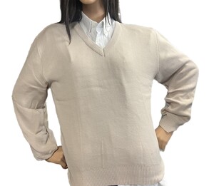 En elegant och lättburen beige damtröja med v-ringad hals som ger ett feminint och tidlöst uttryck. Den stickade strukturen skapar en mjuk och följsam känsla mot kroppen, medan kombinationen av bomull och akryl ger både komfort, slitstyrka och god formhållning över tid. Tröjan är behaglig att bära året runt och fungerar lika bra som ett basplagg till jeans och vardagsbyxor som tillsammans med kjol eller över en skjorta för en mer uppklädd stil.